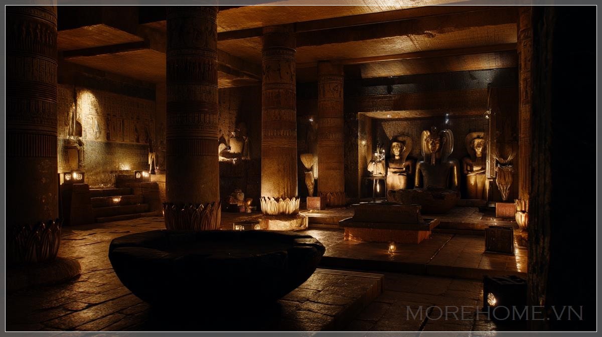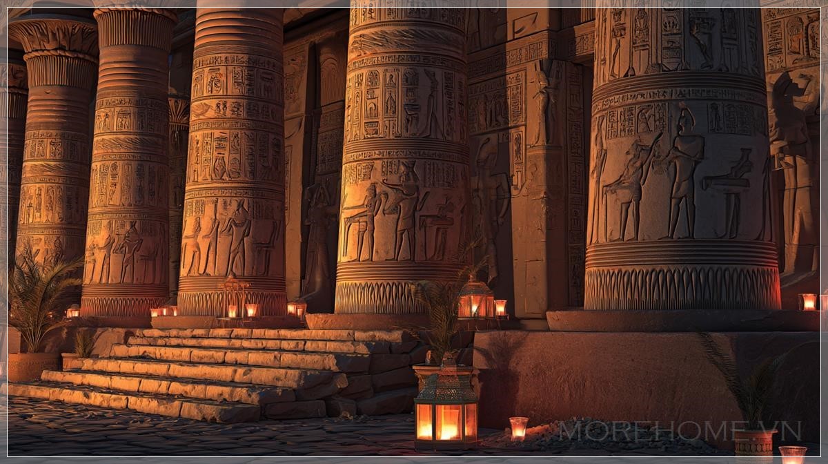 Trong những ngôi đền hùng vĩ, các thầy tế đang chuẩn bị cho nghi lễ buổi tối. Khói hương trầm bay lên từ những bàn thờ bằng đá granit, mang theo lời cầu nguyện đến các vị thần. Ánh sáng từ những ngọn đuốc nhảy múa trên các bức phù điêu tinh xảo, làm cho những hình ảnh của các pharaoh và thần linh như được thổi hồn sống động. Tiếng tụng kinh du dương vang vọng trong những hành lang cao vút, tạo nên một bản giao hưởng thiêng liêng của đức tin và lòng tôn kính.
