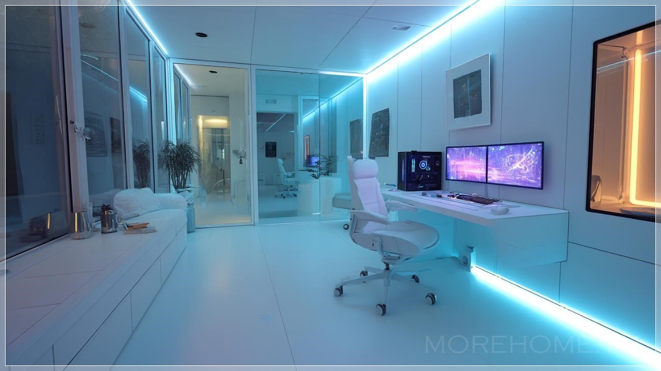 Ánh sáng neon xanh dương âm ỉ lan tỏa khắp căn phòng như những dòng năng lượng tương lai. Không phải ngẫu nhiên mà màu xanh dương được chọn - đây là màu sắc được khoa học chứng minh có tác dụng kích thích sự tập trung và sáng tạo. Những dải LED ẩn sau các khe tường tạo ra hiệu ứng ánh sáng ambient tinh tế, vừa đủ để tạo không khí futuristic mà không gây mỏi mắt trong những giờ làm việc dài.